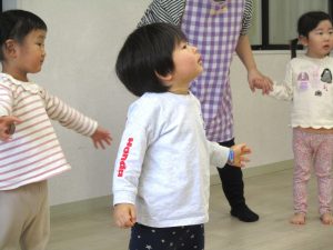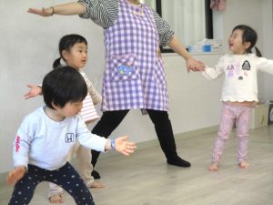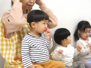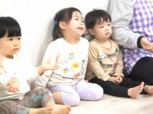 講師や保育士と一緒に、CDの英語の歌に合わせて手遊びをしたり、体を動かしたりして楽しんでいました。