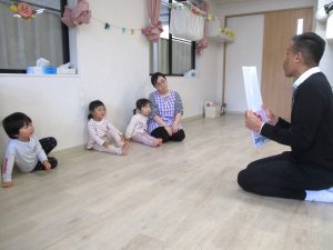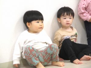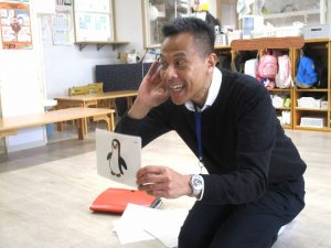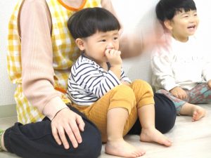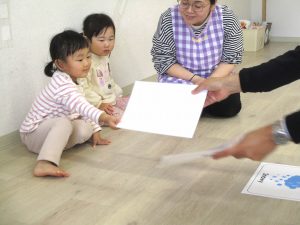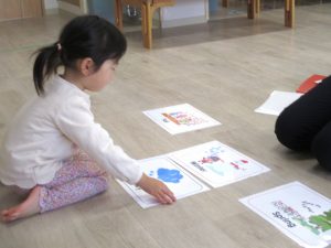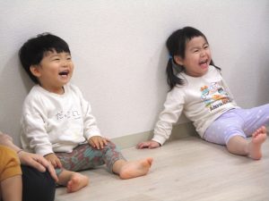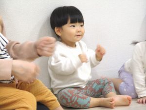 英語の歌に合わせて講師が『いない いない ばあ』をすると、面白かったようで声をあげて笑っていました。