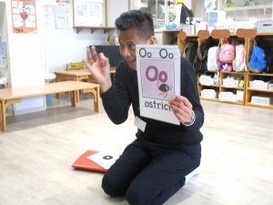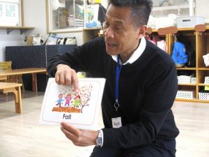 絵カードを見ながら描かれているものを英語で発音する際は、アルファベットや生き物、天気、季節の名前を発音しました。