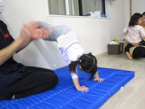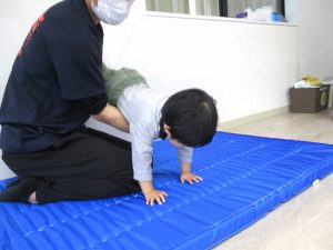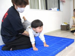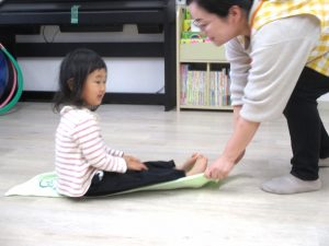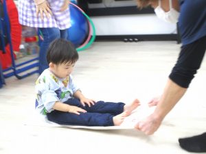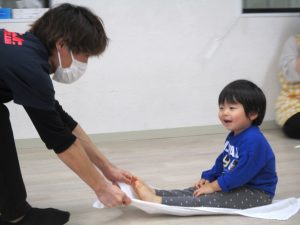 広げたフェイスタオルの上に座り、落ちないようにバランスを取りながら、保育室の端から端へ講師や保育士にタオルを引っぱってもらって移動することに挑戦しました。
