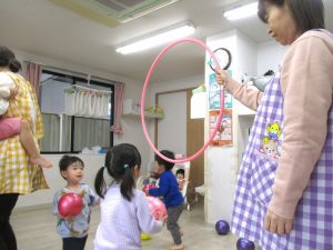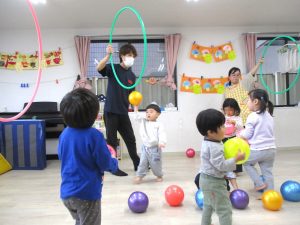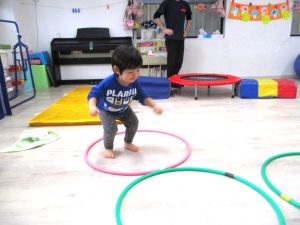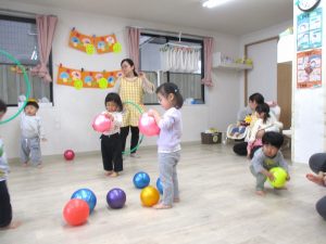 最後のボールを使っての活動では、投げたり、蹴ったり、フープの輪をめがけてボールを投げ、通すことに挑戦したりしました。