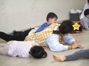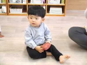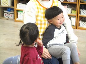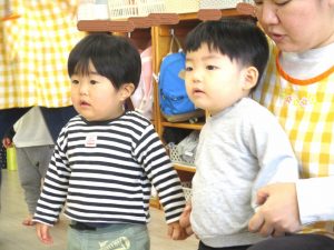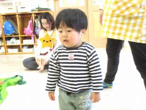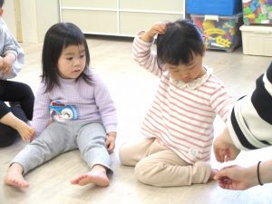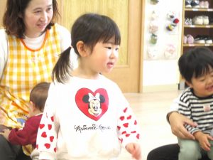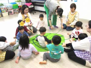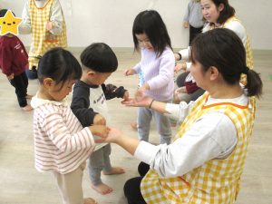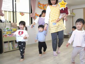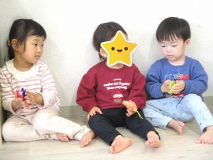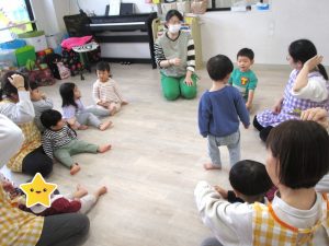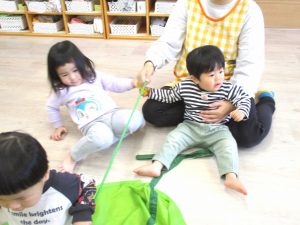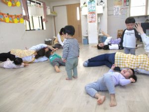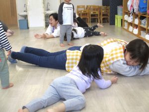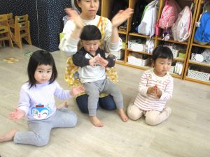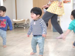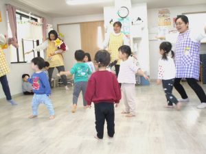 講師のピアノのメロディーに合わせて体を動かしたり、保育室内を散歩したり、教具を使って活動したりしながら楽しんでいました。