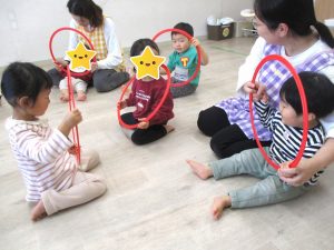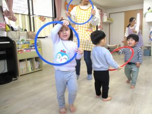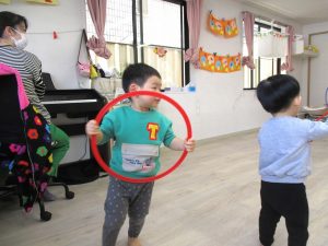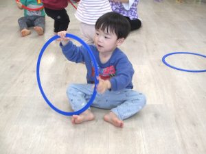 小フープを使っての活動では、フープをハンドルに見立てて車を運転して楽しみました。