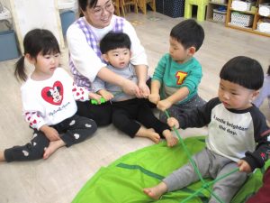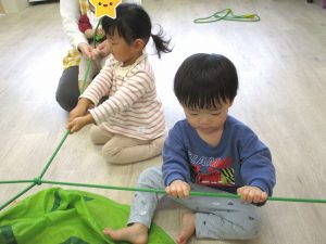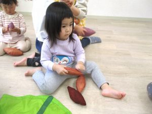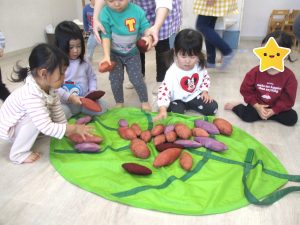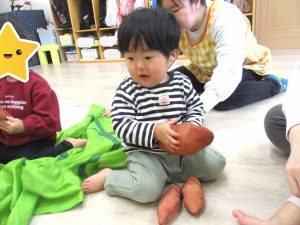 縄や大きな葉っぱの形の布、さつまいもの玩具を使っていもほりごっこや、焼きいもごっこも楽しみました。