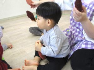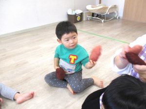 カスタネットを使っての活動では、座ってだけではなく歩きながらカスタネットをたたいて音を鳴らすことに挑戦しました。