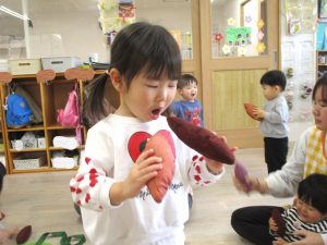 できあがった焼きいもを手に取り、おいしそうに食べる真似もしていました。