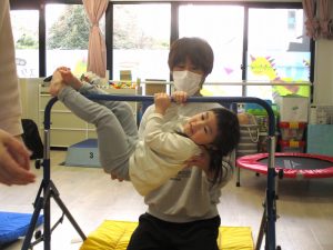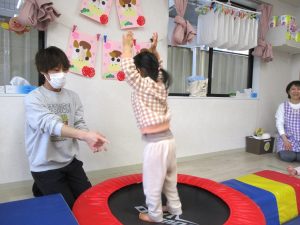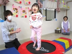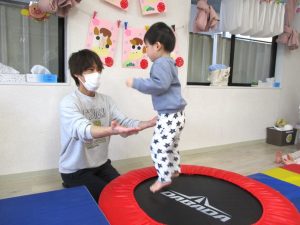 講師の動きを真似しながら友だちや保育士と一緒に体をたくさん動かしたり、トランポリン、鉄棒、マット、フープなどの運動用具を使って活動したりし、楽しそうに取り組んでいました。