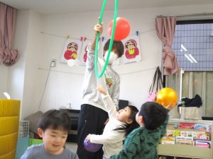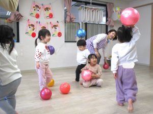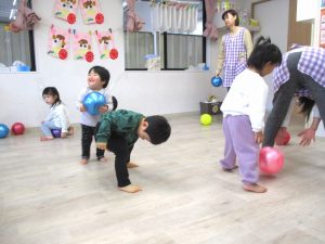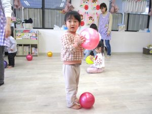 最後のボールを使っての活動では、投げたり、蹴ったり、フープの輪に向かって投げて通したりして楽しみました。