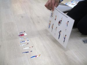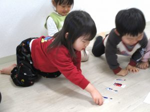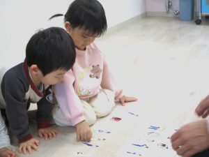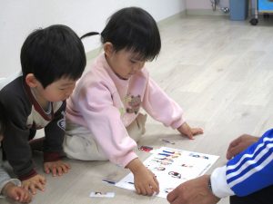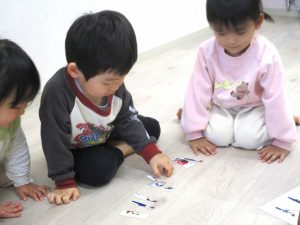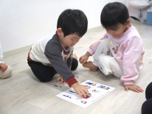 いろいろな職業の人の絵が半分だけ描かれている台紙に、半分に切られている絵カードをくっつけて完成させるゲームをしました。