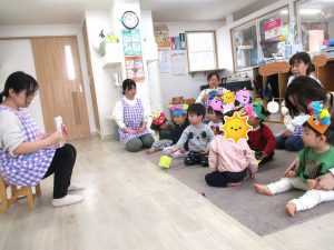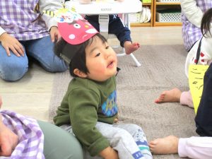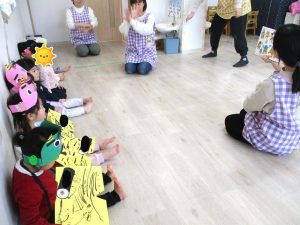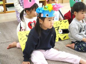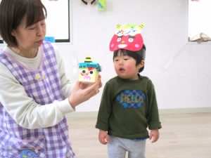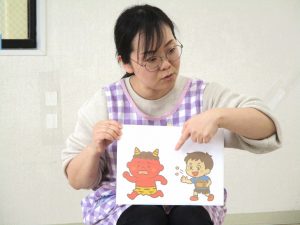 始めに、紙芝居シアターを見ながら節分について話を聞いたり、クイズをしたりしました。