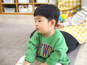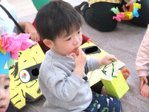 怖くて保育士の後ろに隠れたり、保育士に抱きついたりするお子さんの姿が見られましたが、友だち同士で手をつないで頑張っていたり、鬼をじっと見つめていたりする様子も見られました。