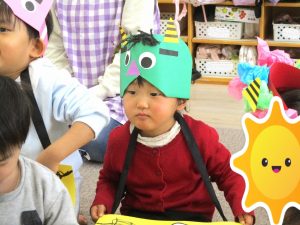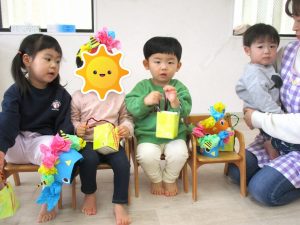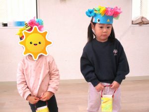 製作作品の発表では、みんなの前に出て、各クラスで製作したお面や豆入れを見せてくれました。