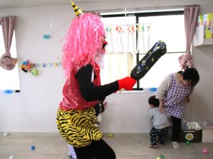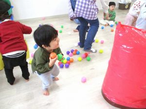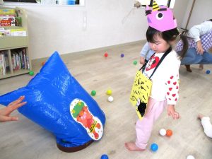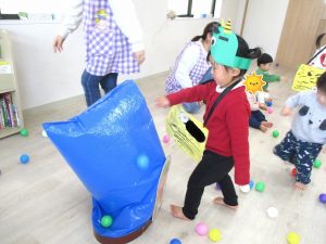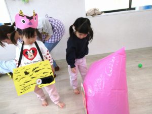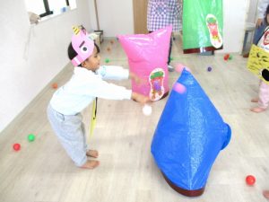 続いて、いろいろな色の鬼に、豆に見立てたボールを投げて豆まきをしました。