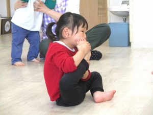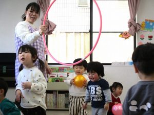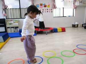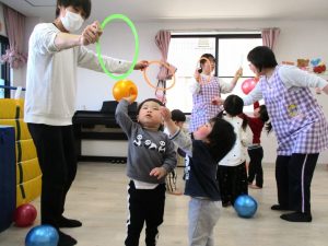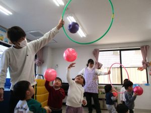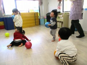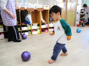 最後のボールを使っての活動では、投げたり、蹴ったり、フープの輪の中に投げ入れたりして楽しんでいました。