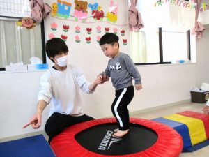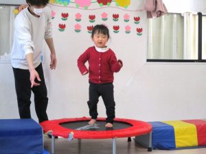 続いてのサーキット遊びでは、トランポリン、マット、鉄棒、ソフト跳び箱、フープなどを使って、たくさん体を動かして楽しみました。